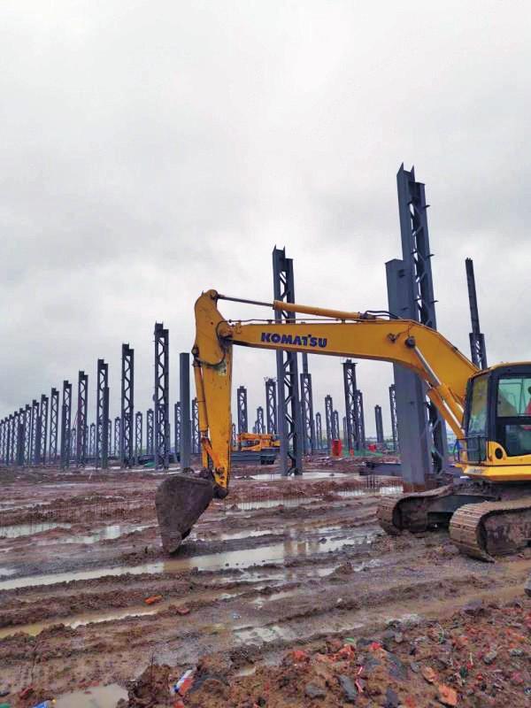 長春國際汽車城一汽紅旗新能源汽車工廠項目現場秩序井然——雨水沿著寬闊的臨時排水溝嘩嘩流淌,積水較深的低洼處,水泵不間斷抽水作業;一根根纜風繩在地錨的幫助下,牢牢固定住新架設的鋼立柱,值班的工人在現場不間斷巡邏,確保工地安全。