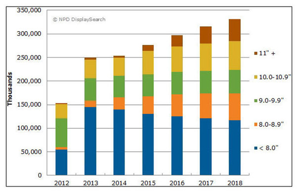 11英寸及以上尺寸的產(chǎn)品在平板電腦銷量中的占比將由今年的2%上升至2018年的14%。NPD DisplaySearch表示,這類平板電腦將直接與13英寸及以下尺寸的筆記本競(jìng)爭(zhēng)。
