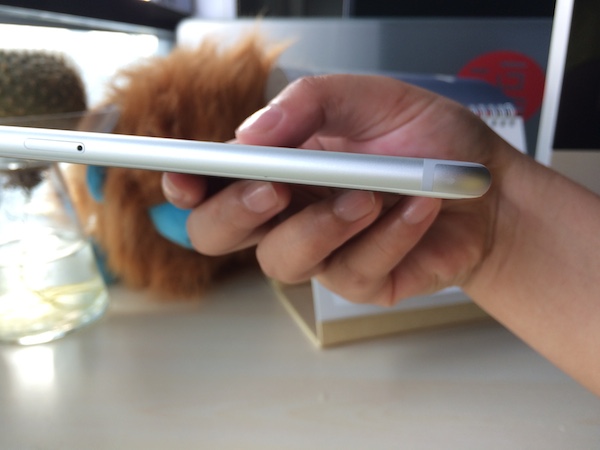 雖然沒有遇到壓彎門,但是還是不建議用戶裸奔,因為 iPhone 6 Plus 的邊框容易受傷。只是從手中滑落在地板上,iPhone 6 Plus 的兩個圓滑邊框就出現了凹陷,雖然不影響使用,也不影響整體美觀,但心里還是有些不舒服。這個問題在 iPhone 5s 也同樣碰到,如圖(好吧,我承認我是一個愛裸奔又毛手毛腳的用戶)。
