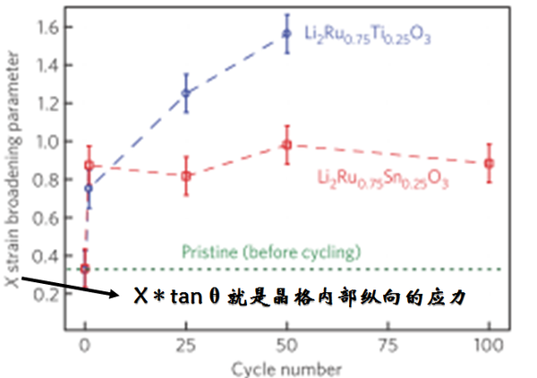 從上圖看到對(duì)比三種材料在充放電不同周數(shù)的微觀應(yīng)力數(shù)值的大小,可以得出摻入了Ti4+的材料內(nèi)部應(yīng)力變化非常大,而摻入了Sn4+的材料則變動(dòng)很小,這種內(nèi)部應(yīng)力的變化究竟是由什么造成呢?在Li2Ru0.75Ti0.25O3這里究竟發(fā)生了什么?我們來看下圖: