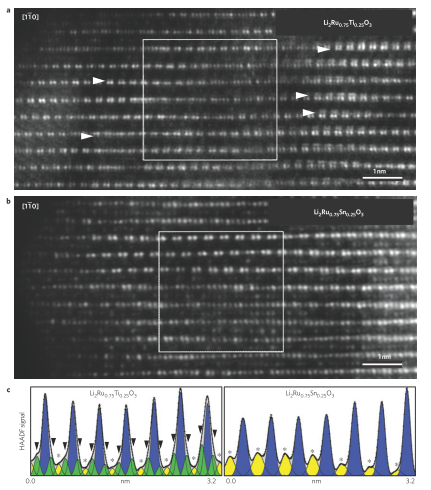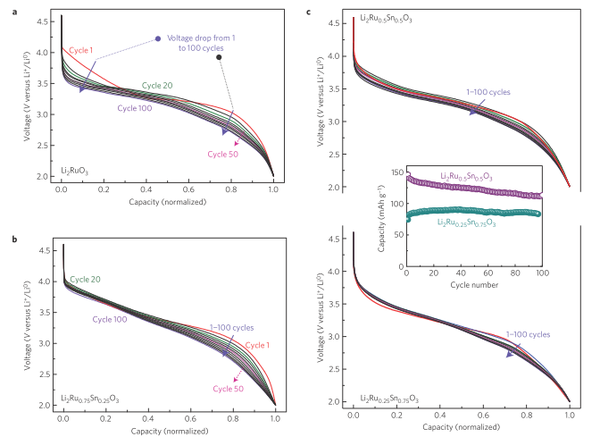 在把不同的材料的放電比容量都?xì)w一化后,可以明顯看到100周后,添加了Sn4+的Li2Ru0.75Sn0.25O3材料和沒有添加Sn4+的Li2RuO3對(duì)比,前者的衰減程度要好得多,再看上圖c,對(duì)著加入Sn4+的濃度的增加(Li2Ru0.75Sn0.25O3和Li2Ru0.25Sn0.75O3),衰減趨勢進(jìn)一步得到控制,但是相應(yīng)的放電比容量也跟著下降!