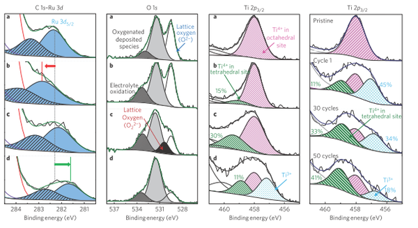 這個(gè)圖我們直接看最右邊的那張,Ti的XPS(X射線光電子能譜分析)數(shù)據(jù)表明,在經(jīng)過了50周的循環(huán)后,四面體間隙的Ti4+含量達(dá)到了41%(通常Ti4+和Ru4+都是穩(wěn)定的呆在八面體間隙),這也是為什么Li2Ru0.75Ti0.25O3的內(nèi)部晶格應(yīng)力變化如此劇烈的原因。