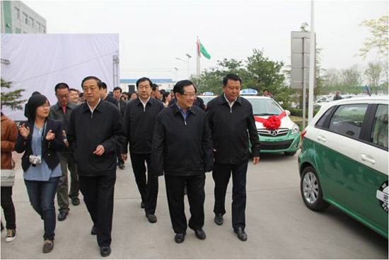 2012年4月19日,全國政協副主席、科技部部長萬鋼(右二)率隊到北汽新能源進行調研