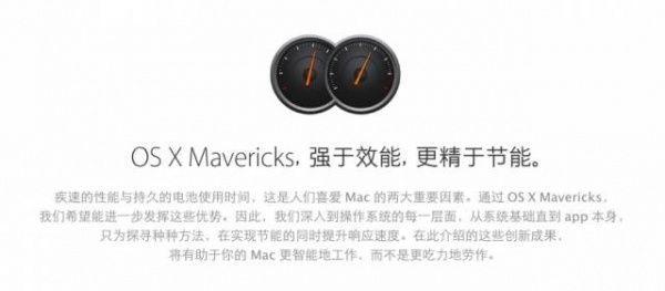 2013年的新款Mac電腦主打功能就是低能耗,這是由于新款Mac搭載了英特爾Haswell處理器。今年6月發布的新款MacBook Air使用了可以使用一整天的電池,即將發布的MacBook Pro也會使用相似的配置。此外,在即將發布的OS X Mavericks系統中,能耗和續航問題也是重點之一。蘋果稱Mavericks是最強大的OS X,也是最省電的操作系統。