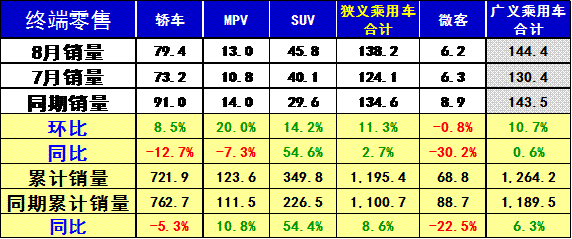8月是秋季開學前的購車高峰期,因此歷年8月的車市零售都是環比增長較好的。今年雖然8月的車市的A0級SUV的結構性走強仍在延續,但近兩個月的上市新車沒有帶來足夠新增量,因此8月的車市增長是缺乏熱點的自然增長。在世界新興市場經濟動蕩中,加之天津港爆炸事故,我們8月的乘用車出口仍是較大的負增長。