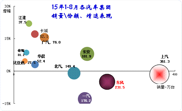 15年1-8月的大集團(tuán)走勢分化嚴(yán)重,一汽和東風(fēng)嚴(yán)重的負(fù)增長,而長安和廣汽表現(xiàn)較好。中小集團(tuán)中只有華晨表現(xiàn)稍差。一汽和東風(fēng)等大集團(tuán)因為商用車的比重較大,經(jīng)濟(jì)下滑影響卡車表現(xiàn),因此表現(xiàn)稍差可以理解。