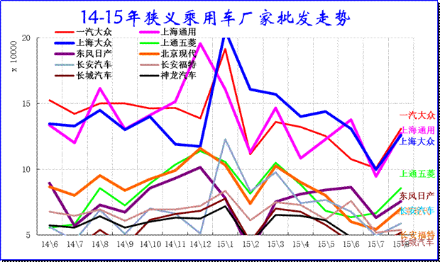 廠家表現(xiàn)分化,15年南北大眾和通用三強(qiáng)中都強(qiáng)力降低批發(fā),降低經(jīng)銷商的庫存壓力,因此8月批發(fā)走勢下降。日系沖刺很猛表現(xiàn)突出。長安沖刺較猛,長安福特表現(xiàn)較強(qiáng),長安系總體超常規(guī)增長。
