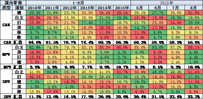 15年自主品牌在SUV市場獲得巨大的份額增長,從41%上升到52%,而德系的SUV從15%下降到10%,這也是巨大的反差。而自主品牌在轎車市場的份額從22%下降到20%。但8月的日系和美系轎車表現(xiàn)較好。