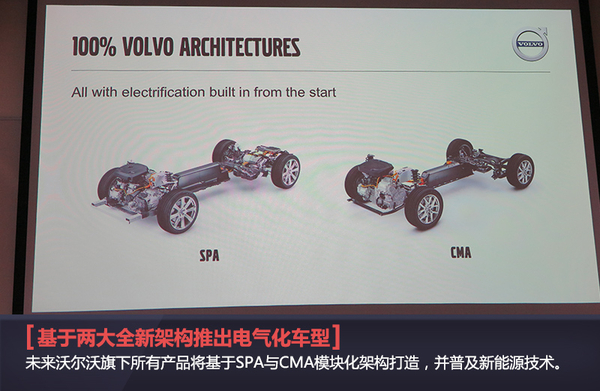 從新一代XC90開始,到2017年旗下所有產品均要完成更新換代,SPA與CMA模塊化架構將是全新產品推出的重要基石。在新能源領域,此前沃爾沃曾推出了C30車型的純電動車,但是隨著全新模塊化架構的研發,沃爾沃在新能源領域將完成蛻變。在沃爾沃的規劃中,未來全系產品將實現電氣化,普及插電混動技術,其中基于SPA模塊化架構打造的車型將采用T8動力系統(2.0T+8AT+電動機),CMA架構開發車型采用T5動力系統(1.5T+7速雙離合+電動機)。同時還將推出純電動車,沃爾沃官方人士向網通社表示:“首款電動車將基于SPA模塊化打造,并在2019年推出,續航里程將超過500公里。”