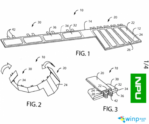 在專利圖上,我們可以看到,電池被分割成很多個小節(jié),并且通過類似手表腕帶的形式進(jìn)行聯(lián)結(jié),多個可折疊的小電池通過層疊的方式可以構(gòu)成一塊標(biāo)準(zhǔn)大小的電池。這樣的設(shè)計(jì)可以充分利用有限度的空間來開發(fā)便攜式電子設(shè)備,這款設(shè)備的外觀可能類似于手表。