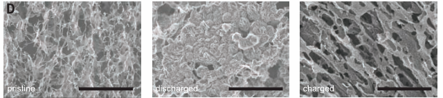 劍橋大學(xué)的研究人員改用多層次的大孔石墨烯作為正極材料,利用水和碘化鋰作為電解液添加劑,最終產(chǎn)生和分解的是氫氧化鋰,而不是此前電池中的過氧化鋰。氫氧化鋰比過氧化鋰要穩(wěn)定,大大降低了電池中的副反應(yīng),提高了電池性能。其中碘化鋰除了幫助分解氫氧化鋰外,似乎還起到了保護(hù)鋰金屬負(fù)極的作用,使電池對(duì)于過量的水有一定的免疫性。沒有它,同量的水會(huì)直接使電池失效,完全無法充放電。由于石墨烯氧化物具有多孔性,研究人員估計(jì)這種電池可循環(huán)超過2000次。