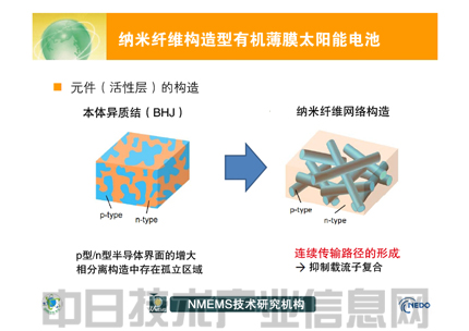 此次的有機(jī)薄膜太陽能電池采用了p型半導(dǎo)體與n型半導(dǎo)體的接觸面積大、可提高發(fā)電效率的本體異質(zhì)結(jié)。而且采用了使p型半導(dǎo)體變成納米級(jí)微細(xì)纖維狀、在其他部分填充了n型半導(dǎo)體的結(jié)構(gòu)(圖3)。