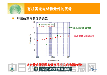采用有機(jī)半導(dǎo)體的太陽能電池的發(fā)電效率已達(dá)到并不遜色于住宅及工業(yè)使用的非晶(多晶)硅型太陽能電池的水平。在目前已公開的產(chǎn)品中,有機(jī)半導(dǎo)體太陽能電池最高水平的效率為12%。在室內(nèi)低于1000lux的照度條件下,其效率高于非晶硅太陽能電池等(圖2)。在室內(nèi)環(huán)境中,有機(jī)薄膜太陽能電池在效率方面也十分有利。