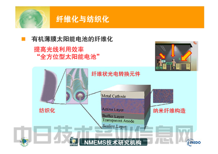 為了實(shí)現(xiàn)在昏暗的室內(nèi)也能高效發(fā)電、成本僅為1000日元的“粘貼型傳感器”,柔性太陽能電池的開發(fā)正在進(jìn)行之中。將把采用可降低成本的有機(jī)半導(dǎo)體制造的薄膜太陽能電池制成nm(10-9m)級(jí)微細(xì)纖維狀,再編織成“布”。計(jì)劃將這種太陽能電池用于植物工廠。日本NMEMS技術(shù)研究機(jī)構(gòu)綠色傳感器網(wǎng)絡(luò)研究所大岡山研究中心主任谷岡明彥以《傳感器網(wǎng)絡(luò)系統(tǒng)中納米纖維獨(dú)立電源的開發(fā)》為題發(fā)表演講,介紹了這種太陽能電池的開發(fā)詳情。