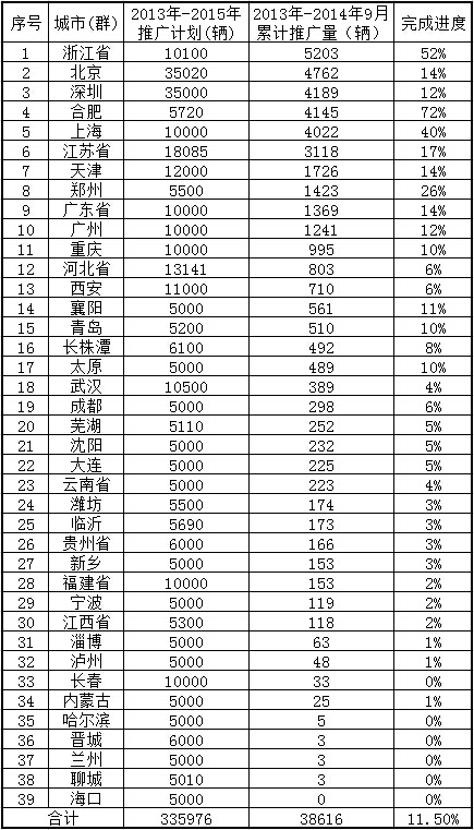 按照新能源汽車推廣應(yīng)用城市(群)申報(bào)計(jì)劃,2013年至2015年39個(gè)推廣應(yīng)用城市(群)將累計(jì)推廣新能源汽車33.6萬輛。截止到2014年9月,我國共推廣新能源汽車38616輛,僅完成計(jì)劃的11.5%。