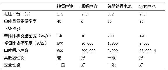 LpTO電池與其他混合動力汽車用儲能單元主要性能參數(shù)對比(表一)