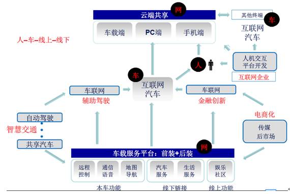 這張圖就是以后投資照這張圖來就可以了(見PPT),相關的智能化主要在這幾個領域,車聯(lián)網(wǎng)有輔助駕駛,對應指揮交通的一些公司、IT公司,還有汽車的消費,就是電商化,金融創(chuàng)新的像車聯(lián)網(wǎng)、UPI各方面,基本上車聯(lián)網(wǎng)是按這張圖來,車跟車互聯(lián)、車跟車庫的互聯(lián)。