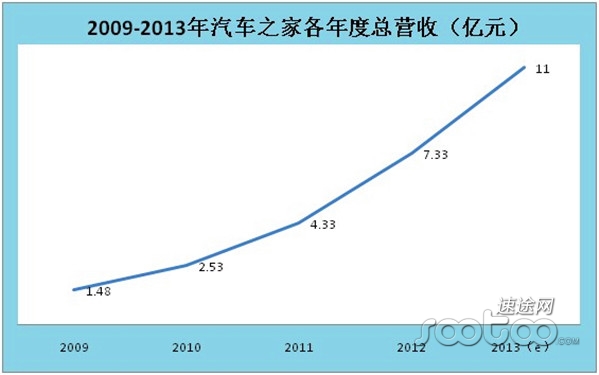 速途研究院整理了汽車之家從2009年至2013年(根據汽車之家前三季度的營收估計)營收的具體情況。2009年汽車之家的營收僅為1.48億元,2010年則增長了近70%,達到了2.53億元。2011年營收4.33億元,2012年營收則達到了7.33億元。預計在2013年全年營收將會達到11億元,與2012年同期相比增長近60%。從營收增長總體來看,汽車之家平均每年復合增長率近70%,這也為其上升提供了有力的市場和財務依據。