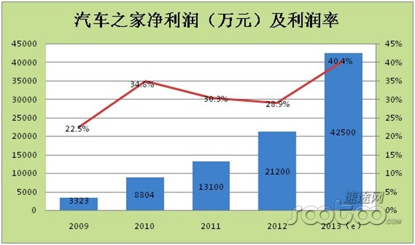 從汽車之家招股書來看,其利潤和利潤率相較于2009年都有顯著提高。2009年凈利潤僅為3323萬元,而到了2012年凈利潤則達到了2.12億元。2013年前三個季度凈營收為3.335億元,預計在2013年全年凈利潤將達到4.25億元,與去年同期相比凈利潤增長100.47%。在利潤率方面,2009年凈利潤率最低,為22.5%,2010年則達到34.8%,2011年30.3%,2012年28.9%,預計在2013年凈利潤率將達到40.4%。凈利潤率增長的主要原因在于汽車之家管理的優化以及目前汽車制造商和代理商在互聯網上的費用投入增長和網絡營銷費用的提升。