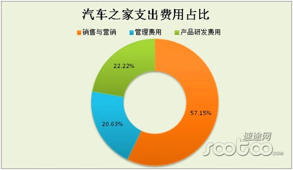 汽車之家的支出費用中,市場銷售與營銷支出占比達到了57.15%。由于汽車之家的主要收入來源于市場廣告,就不得不加大市場銷售與營銷投入來獲得更多的廣告主,從而提高收入來源。其次是產品研發費用,占比為22.22%,主要研發花費在系統和移動端兩個方面。管理費用占比達到了20.63%。