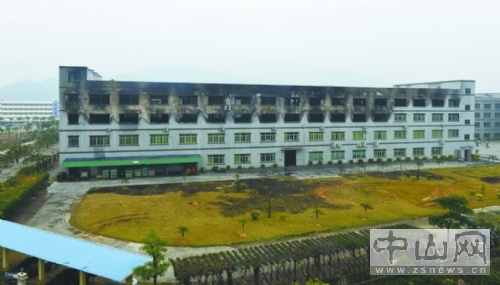 13日,坦洲天貿電池廠大火已被撲滅,一棟廠房損毀嚴重,一些窗口仍有青煙飄出。 前晚,坦洲鎮第三工業區天貿電池廠一棟四層樓倉庫突發火災,大火燒了4個多小時才被控制。坦洲鎮政府通