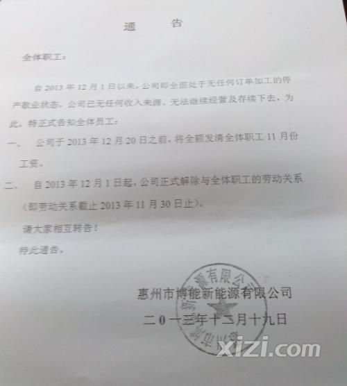 中國電池雜志-中國電池網(wǎng)12月30日訊(趙卓然  北京報道)今早接到網(wǎng)友爆料,12月19日惠州博能新能源有限公司向全體員工發(fā)布通告稱,公司自12月1日以來,已經(jīng)處于無任何訂單加工的停產(chǎn)歇業(yè)狀態(tài),公司已無任何收入來源,無法經(jīng)營及存續(xù)下去,告知全體員工:12月20日之前將全額發(fā)放11月工資;自12月1日起,公司正式解除與全體員工的勞動關(guān)系,請大家互相轉(zhuǎn)告。