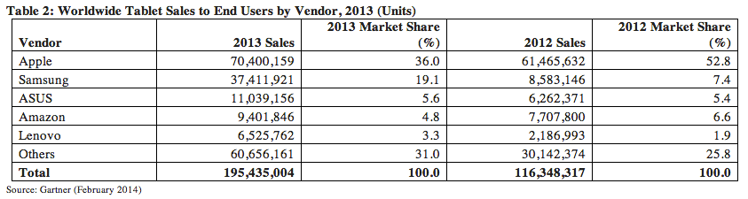 Gartner報告顯示,廠商方面,蘋果依舊一枝獨(dú)秀:去年iPad銷量達(dá)到7000萬部,份額為36%;三星憑借Galaxy系列,在平板電腦市場份額突飛猛進(jìn):去年三星平板銷量為3700萬部、占比19%。而在2012年時,蘋果在平板電腦市場份額高達(dá)53%,而三星份額僅為7%。華碩平板去年銷量為1100萬部,市場份額為5.6%,列第三。