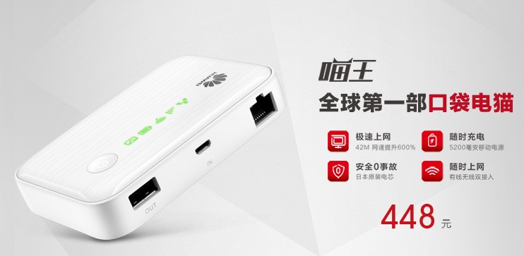 12月16日,華為推出一款集無線路由器等功能于一體的移動電源,售價為448元的“喵王”,鋰電池組電壓3.7V,容量為5200mAh;官網顯示,新產品采用的是日本SANYO、SONY的進口原裝電芯。