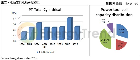 EnergyTrend指出,在IT需求逐漸走向輕薄化而減少電池芯顆數的趨勢下,動力工具更是電池芯廠積極加入的藍海市場;由于電動工具功率輸出較高,產品壽命要求也較為嚴苛,市場需求穩定發展,然同樣面臨電池容量提升而使用顆數降低的現象,因此今年度鋰電池在電動工具市場需求仍維持持平局面,約占2.2億顆。