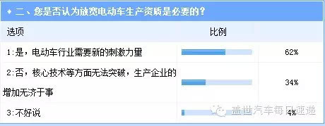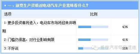 另外,還有一個利好的大背景,在多重鼓勵政策的刺激下,國內新能源車市場發展已經明顯提速,而隨著更多投資者的持續涌入,電動汽車行業在今后兩年來迎來爆發并非不可能,在調查1中,持此觀點者占比43%。