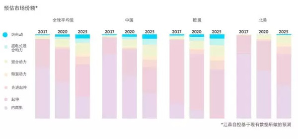 根據江森自控基于車企產能的預測,無論是中國、北美還是歐盟,到2020年,甚至2025年,純電動以及插電式混合動力汽車的份額都十分有限。