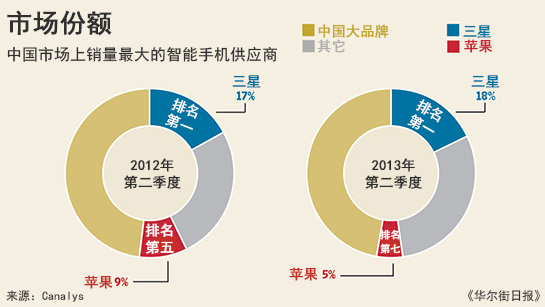 據研究機構Canalys提供的數據顯示,目前三星電子在中國智能手機市場排名第一,市場占有率達到18%,而隨著其他手機廠商實力的壯大,蘋果公司的排名已經落至第七位,市場占有率僅為5%。