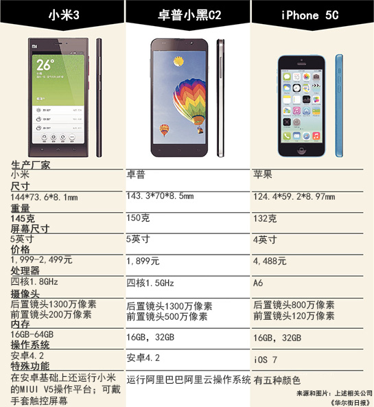以中國生產的卓普小黑C2 (Zopo C2)手機為例。這款搭載安卓(Android)系統的智能手機擁有完整的高清屏幕,1,310萬像素的攝像頭以及高速圖像處理器。而這樣一款高配置手機的售價僅略高于300美元,與三星Galaxy S4和蘋果iPhone超過600美元的裸機價格相比更具誘惑力。此外,小米公司(Xiaomi Inc.)新推出的小米3智能手機售價僅為人民幣1,999元(約合327美元),而金立(Gionee)的Dream D1智能手機售價更是低至230美元。