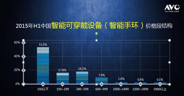 通過奧維云網(AVC)數據可以看出,2015年上半年智能手表的價格結構主要集中在300元到1000元之間,占到50%以上,而蘋果iwatch 的價格在3000元以,提升了智能可穿戴產品價格段,包括三星、LG發布的高端產品未來都會有所上升。智能手環150元以下的初型產品和初創產品占比達 53.5%,3000元以上的產品僅占11.2%。