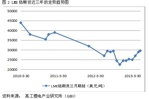 觀察近三年以來(lái)鈷期貨價(jià)格,來(lái)自LME鈷期貨三月期鈷的價(jià)格顯示LME鈷期貨三月期鈷在2010年3月份的時(shí)候高達(dá)45000美元/噸,此后一路逐波下滑,到2012年11月30日的時(shí)候一度跌到22500美元/噸,和高點(diǎn)相比,正好腰斬,此后展開(kāi)反彈,1月3日的買(mǎi)入價(jià)為24500美元/噸,到1月底就基本維持在26000美元/噸,而后一直圍繞25000美元/噸進(jìn)行震蕩,4月后,開(kāi)始出現(xiàn)持續(xù)走高,最高觸及30000美元/噸,目前LME鈷期貨三月期鈷的買(mǎi)入價(jià)為29650美元/噸,相比一月初的22500美元/噸,大漲超過(guò)31.7%(圖2)。