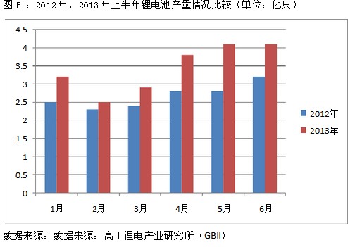 智能手機(jī)、平板電腦、移動(dòng)電源等新興市場(chǎng)的持續(xù)高增長(zhǎng)直接帶動(dòng)了鋰電池產(chǎn)量的同比大幅增長(zhǎng),而這也成為鈷酸鋰消費(fèi)強(qiáng)有力的增長(zhǎng)點(diǎn)。根據(jù)高工鋰電產(chǎn)業(yè)研究所(GBII)調(diào)研,2013年上半年鋰電池產(chǎn)量為20.48億自然只(折合成2200mAH18650的規(guī)格統(tǒng)計(jì)),相比2012年的16億只同比增長(zhǎng)28%(圖4)。隨著去庫(kù)存化的完成,鋰電池企業(yè)生產(chǎn)趨旺,行業(yè)呈現(xiàn)初步的好轉(zhuǎn)趨勢(shì),直接帶動(dòng)了鈷酸鋰的需求增長(zhǎng)。