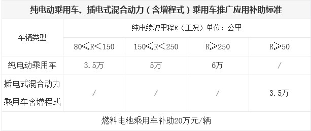 新的補(bǔ)貼政策是以在電力驅(qū)動下行駛的里程為指標(biāo),新規(guī)定指出,乘用車以純電行駛里程(R)為標(biāo)準(zhǔn),插電式混合動力乘用車(含增程式)R≥50每車補(bǔ)貼3.5萬元,純電動乘用車80≤R<150每車3.5萬、150≤R<250每車5萬、R≥250每車6萬元。新的補(bǔ)貼公告附表中,特別提到了燃料電池乘用車(補(bǔ)貼20萬)和燃料電池商用車(補(bǔ)貼50萬)的補(bǔ)助標(biāo)準(zhǔn)。