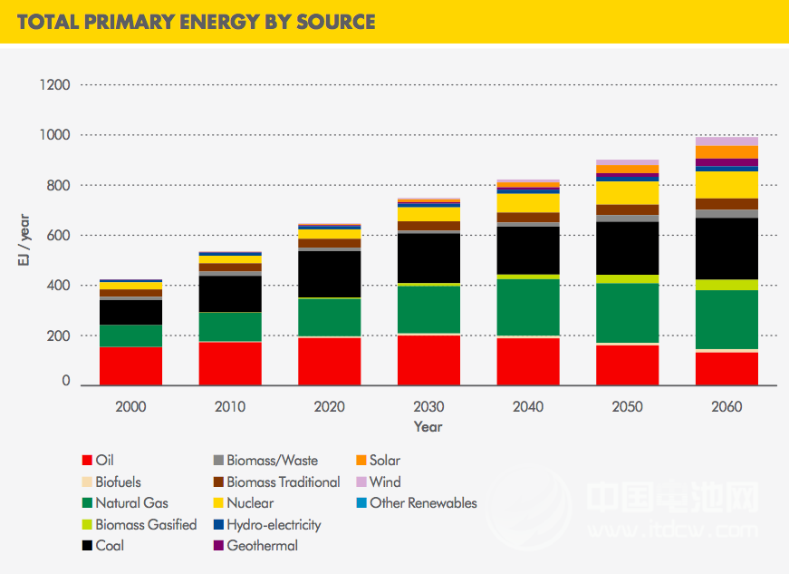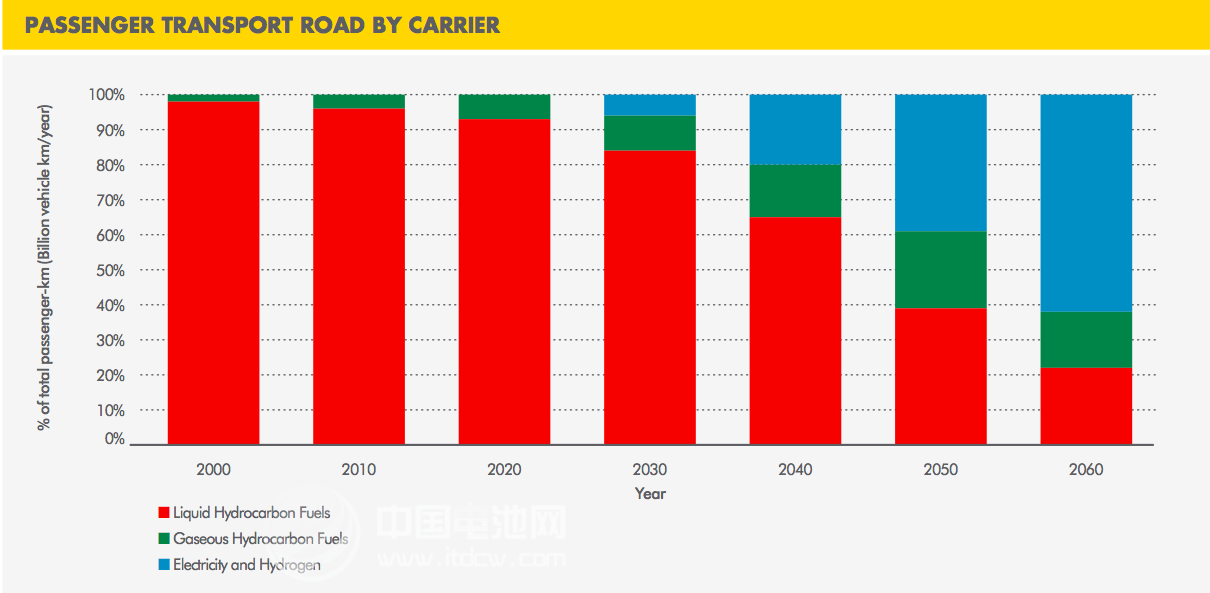 非常明顯,液態(tài)的碳氫燃料從2000年時的98%左右的占有率,一路呈下滑趨勢,一直到2060年,只有22%左右的占有率。這實際上說的就是汽油、柴油等內(nèi)燃機燃料開始逐步退出歷史舞臺。相反,氣態(tài)的碳氫燃料(如天然氣)的使用率從2000年開始穩(wěn)定提升,至2050前前后到達頂峰,隨后從2060年前后開始下滑。同樣是不可再生能源,之后的走勢可想而知,會逐步下滑。