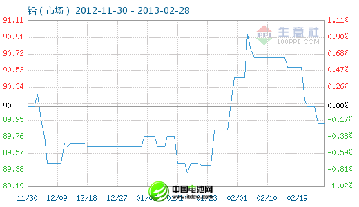 2月27日鉛(市場)商品指數(shù)為89.92,與昨日持平,較周期內(nèi)最高點100.00點(2011-09-01)下降了10.08%,較2011年09月29日最低點86.80點上漲了3.59%。(注:周期指2011-09-01至今)