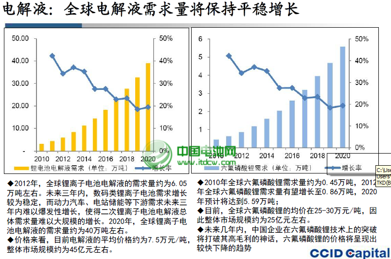 2012年,全球鋰離子電池電解液的需求量約為6.05萬噸左右。未來三年內,數碼類鋰離子電池需求增長較為穩定。