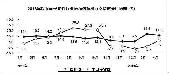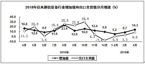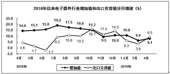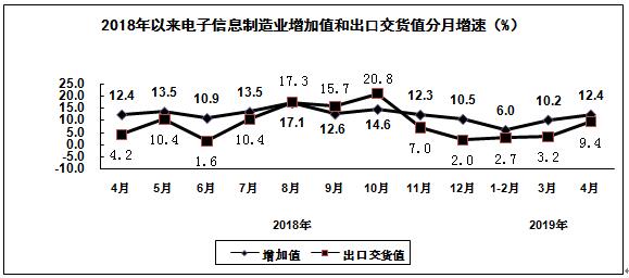 2019年1-4月,規(guī)模以上電子信息制造業(yè)增加值同比增長9.0%,增速比去年同期回落3.6個(gè)百分點(diǎn)。4月份增加值同比增長12.4%,增速比上月加快2.2個(gè)百分點(diǎn)。
