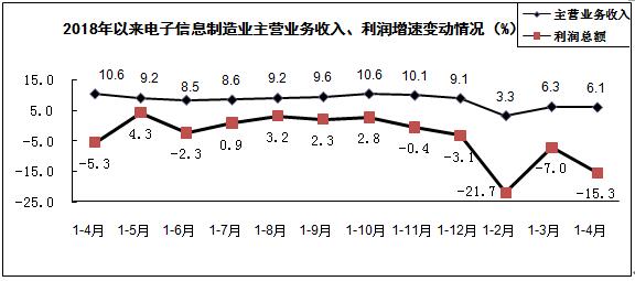 1-4月,電子器件制造業(yè)營業(yè)收入同比增長10.6%,利潤同比下降23.6%。