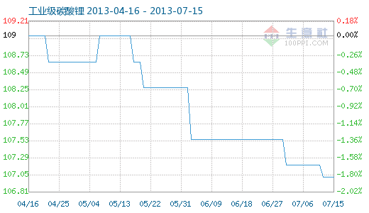 7月15日工業(yè)級(jí)碳酸鋰商品指數(shù)為107.01,與昨日持平,較周期內(nèi)最高點(diǎn)112.10點(diǎn)(2012-11-04)下降了4.54%,較2012年01月05日最低點(diǎn)98.94點(diǎn)上漲了8.16%。(注:周期指2011-09-01至今)
