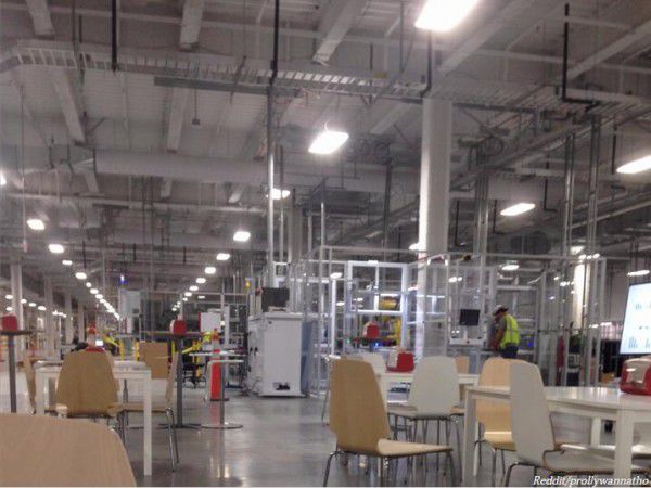 生產區廣角鏡頭。能看到忙碌的工人,以及一些貌似用來休息的桌子和椅子。
