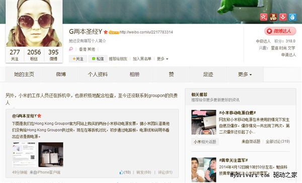 移動(dòng)電源發(fā)生爆炸的用戶@G兩本圣經(jīng)Y剛剛也在微博上表示她買到的確實(shí)不是正品小米移動(dòng)電源,具體是從Hong Kong Groupon官網(wǎng)上購(gòu)買的,而小米則表示他們并沒有給Hong Kong Groupon供過貨。