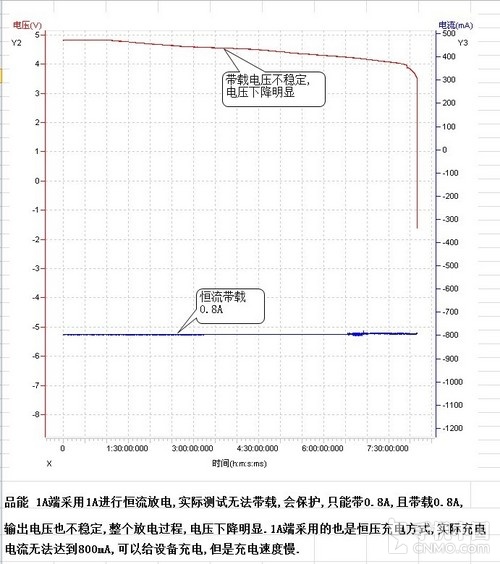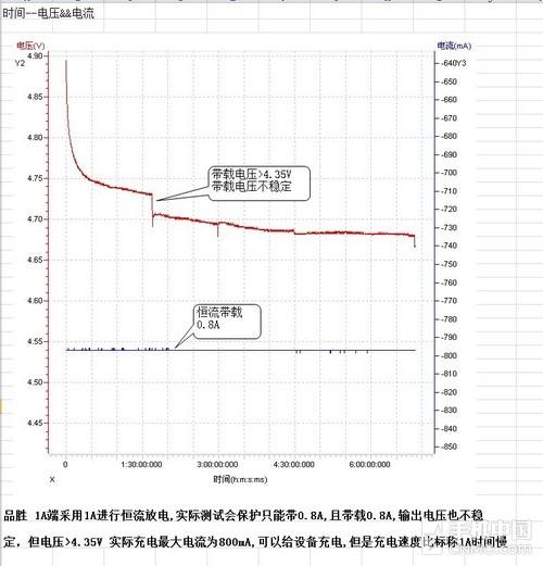 另外還有像像品能與品勝等10000mAh級電池在5V 1A的標準輸出規格下都很不穩定,產品甚至要降到0.7A電流時,產品才能做到到穩定的輸出以及較高的轉換效率,實際上如果連正常狀態的穩定輸出都不能保證,也沒什么必要談轉換率了,因為已經失去最基本的使用意義了。