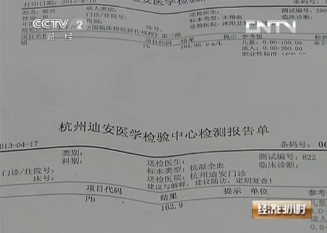 幾位家長都很擔(dān)心孩子的身體出現(xiàn)問題,分別去醫(yī)院對孩子的身體進行了檢測,查來查去找不到原因,最終,他們決定做一下血鉛檢測,檢測結(jié)果讓所有家長們大吃一驚。檢測結(jié)果顯示,這幾個孩子血液中的血鉛含量都超過了100微克每升,最高的竟然達到了162.9微克每升。