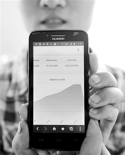 圖②:鄭州市上街區(qū)口頭村村民張海潤在自家房頂安裝的光伏發(fā)電設(shè)備通過了鄭州供電公司的檢測。現(xiàn)在他可以在手機上查看個人光伏發(fā)電系統(tǒng)的實時信息。