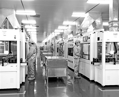 圖③:在英利的太陽能電池生產(chǎn)車間,員工們查看機器生產(chǎn)情況。