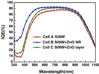 鑒于ZnO納米線優異的光電特性和較高的載流子遷移率,賈銳團隊創新性地將ZnO納米線引入黑硅太陽能電池,在硅納米結構間隙生長出橫向接觸的ZnO納米線。橫向接觸的ZnO納米線能夠促進光生載流子的橫向輸運與收集,有效降低了接觸電阻,提高了電池效率。ZnO納米線黑硅電池的I-V特性、光譜響應及量子效率等測試結果表明,ZnO納米線的嵌入未改變黑硅電池良好的陷光特性,且明顯改善了電極接觸及載流子輸運等特性,這從原理角度證明了ZnO納米線有助于黑硅電池效率的提升。ZnO材料成本低,制備工藝簡單,與現有的晶體硅電池工藝具有良好的工藝兼容性,具有廣闊的應用前景。賈銳團隊目前正致力于將該創新成果及技術向高效背接觸和異質結背接觸電池研究方面轉移。